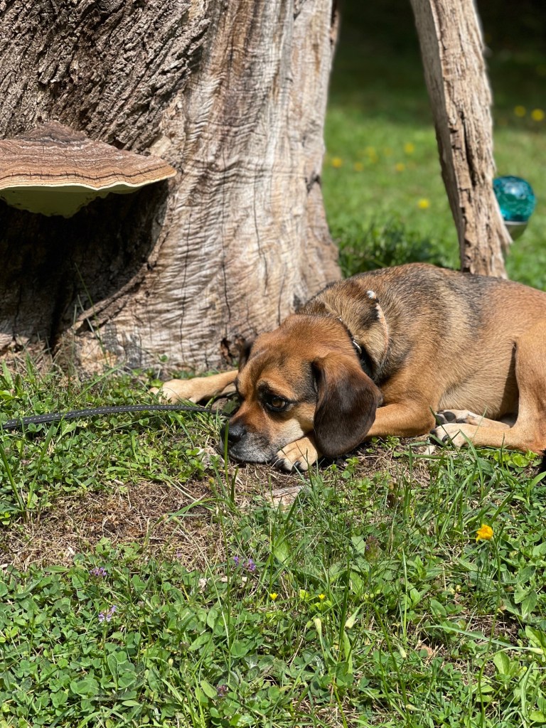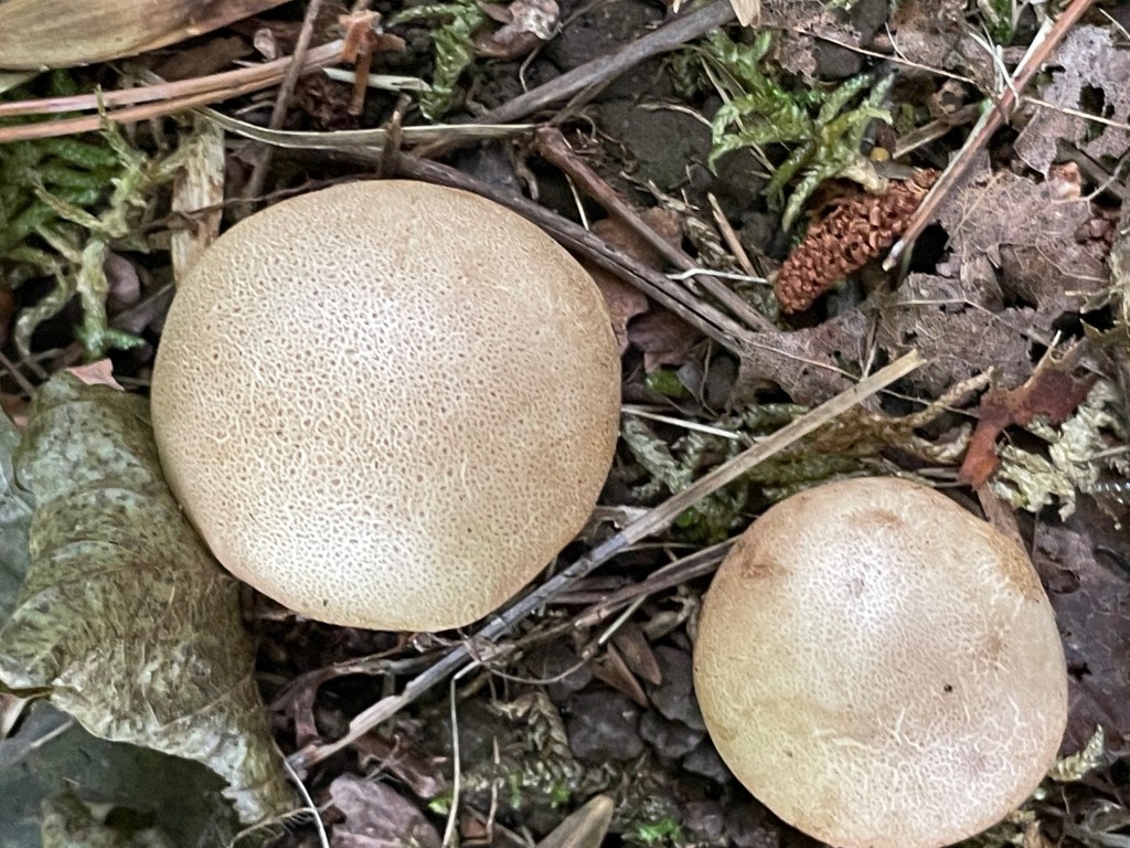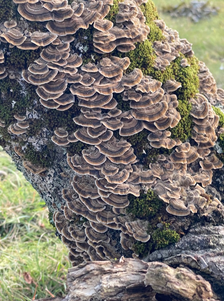 The first great mushroom we found was firmly affixed to a tree stump. It’s a shelf type mushroom and has garnered a bit of interest from our pups. Fortunately, they seem more interested in keeping it company than using it as a chew toy. It seems like a possible Turkey-tail but it’s bigger and doesn’t have any overlapping growths.