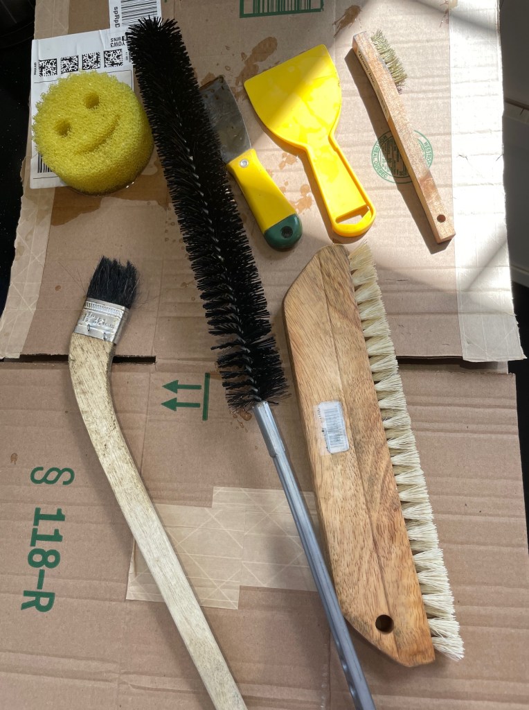 Here’s a photo of my favorite tools. A surprise helper was a brush that was included in a wallpapering kit. I never used it for wallpaper but it was long and thin enough to be helpful in cleaning between the fins.