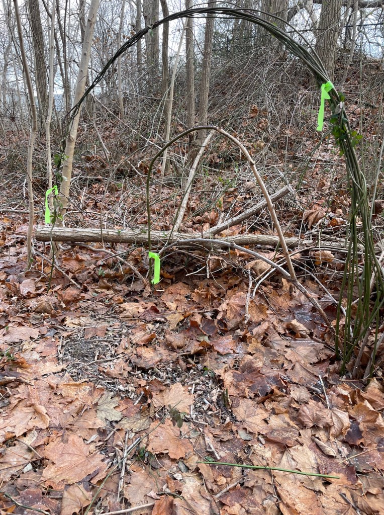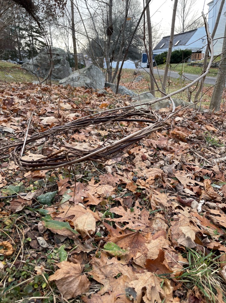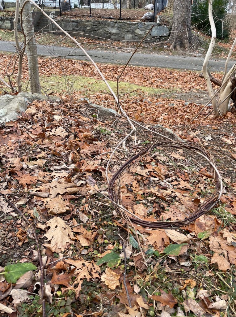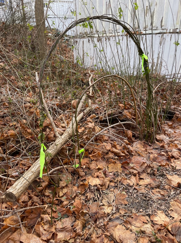 Roses naturall form curved shapes, so the easiest way to start was with circles. I’ve got a few of them going right now and my first intention was to use them as part of an agility course for the dogs. But, little humans will love them as well and I’m not going to lie, I too like to duck through these little magical portals. I’ve started creating moon gates—low and high circular shapes woven from the very roses I’ve been cutting back.